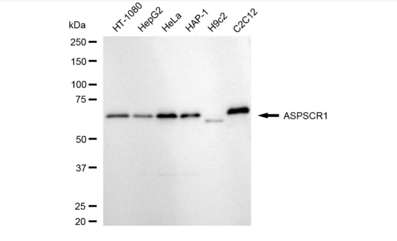 Western blotting analysis using ASPSCR1 antibody. Total cell lysates (30 μg) from various cell lines were loaded and separated by SDS-PAGE. The blot was incubated with ASPSCR1 antibody and HRP-conjugated goat anti-rabbit secondary antibody respectively.