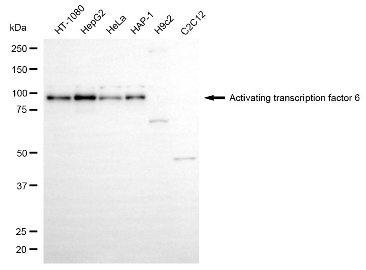 Western blotting analysis using activating transcription factor 6 antibody. Total cell lysates (30 μg) from various cell lines were loaded and separated by SDS-PAGE. The blot was incubated with activating transcription factor 6 antibody and HRP-conjugated goat anti-rabbit secondary antibody respectively.