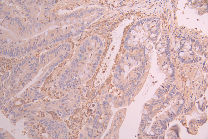 IHC image of CSB-RA554727A0HU diluted at 1:100 and staining in paraffin-embedded human colorectal cancer performed on a Leica BondTM system. After dewaxing and hydration, antigen retrieval was mediated by high pressure in a citrate buffer (pH 6.0). Section was blocked with 10% normal goat serum 30min at RT. Then primary antibody (1% BSA) was incubated at 4°C overnight. The primary is detected by a Goat anti-rabbit polymer IgG labeled by HRP and visualized using 0.05% DAB.