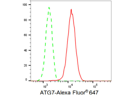 Flow cytometric analysis of ATG7 expression in HT-1080 cells using ATG7 antibody. Green, isotype control; red, ATG7.