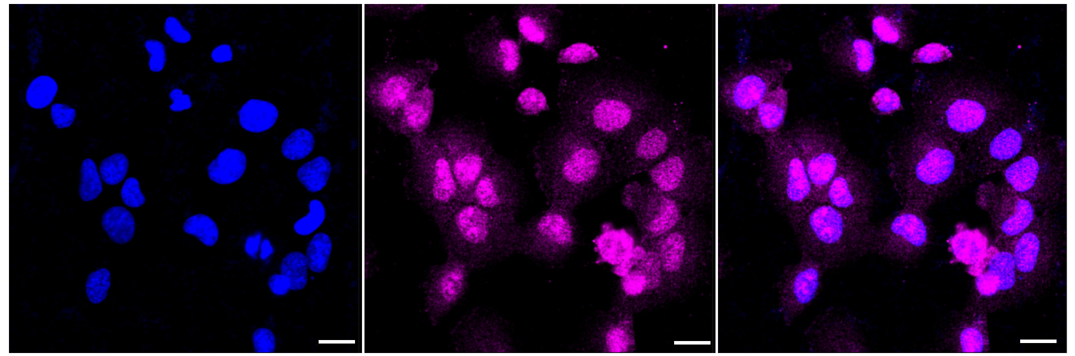 Immunocytochemical staining of HT-1080 cells with ATG7 antibody. Nuclei were stained blue with DAPI; ATG7 was stained magenta with Alexa Fluor? 647. Images were taken using Leica stellaris 5. Protein abundance based on laser Intensity and smart gain: Medium. Scale bar: 20 μm.