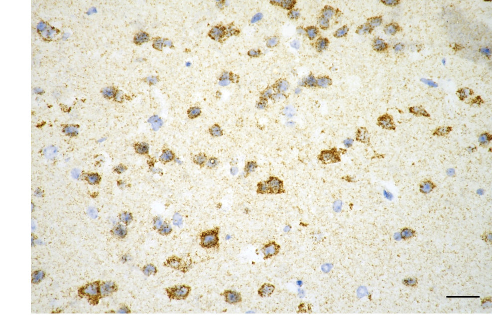 Immunohistochemistry was performed on paraffin-embedded mouse brain using ATP5B antibody. Antigen retrieval was done in sodium citrate buffer (pH 6.0). DAB was used for detection, with hematoxylin counterstaining. Images were acquired using a Nikon Ci-L Plus microscope (40× objective). Scale bar: 25 μm.