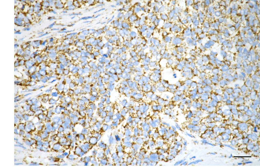 Immunohistochemistry was performed on paraffin-embedded human breast carcinoma using ATP5B antibody. Antigen retrieval was done in sodium citrate buffer (pH 6.0). DAB was used for detection, with hematoxylin counterstaining. Images were acquired using a Nikon Ci-L Plus microscope (40× objective). Scale bar: 25 μm.