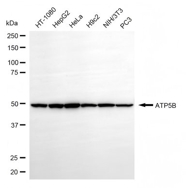 Western blotting analysis using ATP5B antibody. Total cell lysates (20 μg) from various cell lines were loaded and separated by SDS-PAGE. The blot was incubated with ATP5B antibody and HRP-conjugated goat anti-rabbit secondary antibody respectively.