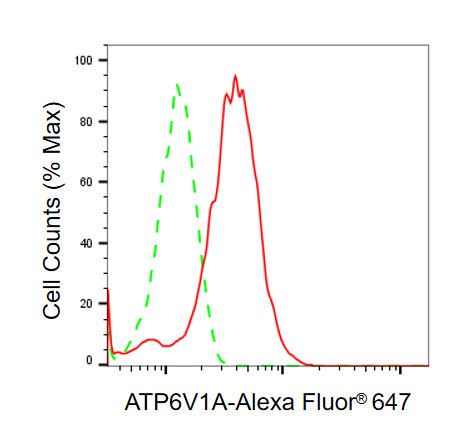 Flow cytometric analysis of ATP6V1A expression in HepG2 cells using ATP6V1A antibody. Green, isotype control; red, ATP6V1A.