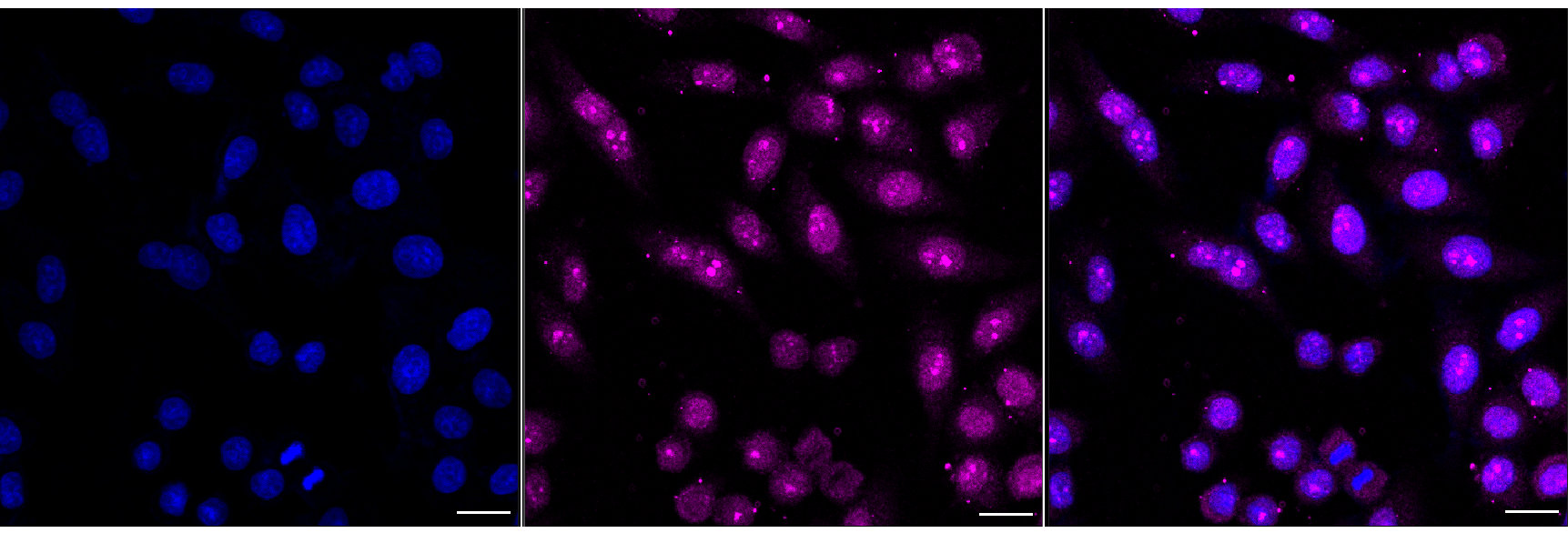 Immunocytochemical staining of HepG2 cells with ATP6V1A antibody. Nuclei were stained blue with DAPI; ATP6V1A was stained magenta with Alexa Fluor? 647. Images were taken using Leica stellaris 5. Protein abundance based on laser Intensity and smart gain: Medium. Scale bar, 20 μm.