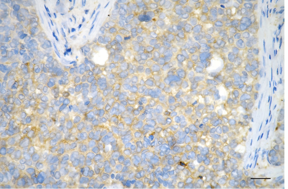 Immunohistochemistry was performed on paraffin-embedded human breast carcinoma using ATP6V1A antibody. Antigen retrieval was done in sodium citrate buffer (pH 6.0). DAB was used for detection, with hematoxylin counterstaining. Images were acquired using a Nikon Ci-L Plus microscope (40× objective). Scale bar: 25 μm.