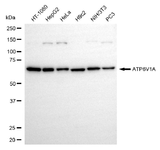 Western blotting analysis using ATP6V1A antibody. Total cell lysates (30 μg) from various cell lines were loaded and separated by SDS-PAGE. The blot was incubated with ATP6V1A antibody and HRP-conjugated goat anti-rabbit secondary antibody respectively.