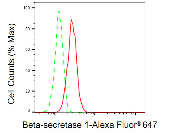Flow cytometric analysis of Beta-secretase 1 expression in C2C12 cells using Beta-secretase 1 antibody. Green, isotype control; red, Beta-secretase 1.