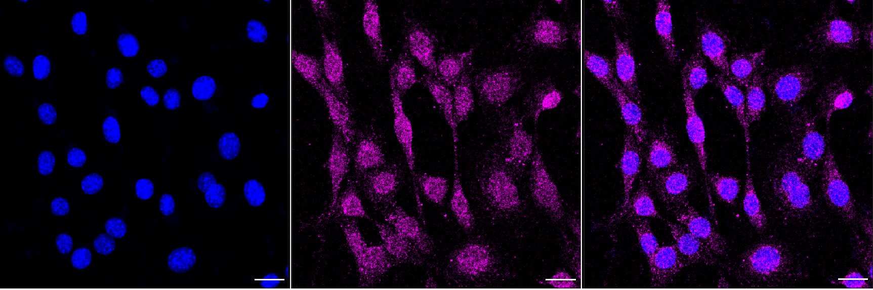 Immunocytochemical staining of C2C12 cells with Beta-secretase 1 antibody. Nuclei were stained blue with DAPI; Beta-secretase 1 was stained magenta with Alexa Fluor? 647. Images were taken using Leica stellaris 5. Protein abundance based on laser Intensity and smart gain: Low. Scale bar, 20 μm.