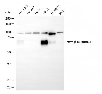 Western blotting analysis using beta-secretase 1 antibody. Total cell lysates (30 μg) from various cell lines were loaded and separated by SDS-PAGE. The blot was incubated with beta-secretase 1 antibody and HRP-conjugated goat anti-rabbit secondary antibody respectively.