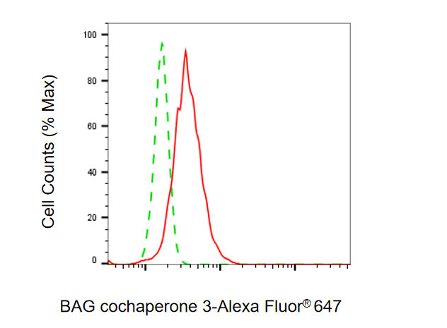 Flow cytometric analysis of BAG cochaperone 3 expression in HepG2 cells using BAG cochaperone 3 antibody. Green, isotype control; red, BAG cochaperone 3.