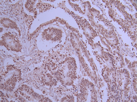 IHC image of CSB-RA098504A0HU diluted at 1:100 and staining in paraffin-embedded human colorectal cancer performed on a Leica BondTM system. After dewaxing and hydration, antigen retrieval was mediated by high pressure in a citrate buffer (pH 6.0). Section was blocked with 10% normal goat serum 30min at RT. Then primary antibody (1% BSA) was incubated at 4°C overnight. The primary is detected by a Goat anti-rabbit polymer IgG labeled by HRP and visualized using 0.05% DAB.