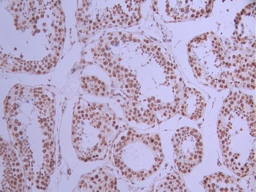 IHC image of CSB-RA098504A0HU diluted at 1:100 and staining in paraffin-embedded human testis tissue performed on a Leica BondTM system. After dewaxing and hydration, antigen retrieval was mediated by high pressure in a citrate buffer (pH 6.0). Section was blocked with 10% normal goat serum 30min at RT. Then primary antibody (1% BSA) was incubated at 4°C overnight. The primary is detected by a Goat anti-rabbit polymer IgG labeled by HRP and visualized using 0.05% DAB.