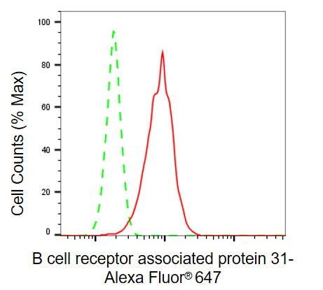 Flow cytometric analysis of B cell receptor associated protein 31 expression in HepG2 cells using B cell receptor associated protein 31 antibody. Green, isotype control; red, B cell receptor associated protein 31.