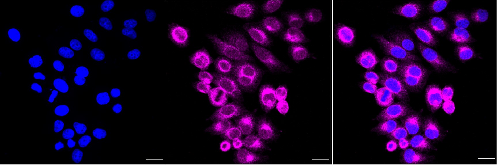 Immunocytochemical staining of HepG2 cells with B cell receptor associated protein 31 antibody. Nuclei were stained blue with DAPI; B cell receptor associated protein 31 was stained magenta with Alexa Fluor? 647. Images were taken using Leica stellaris 5. Protein abundance based on laser Intensity and smart gain: Medium. Scale bar, 20 μm.