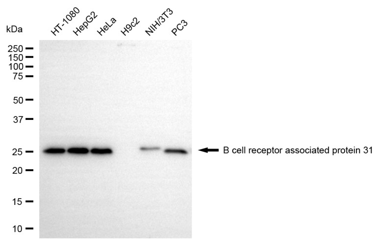 Western blotting analysis using B cell receptor associated protein 31 antibody. Total cell lysates (30 μg) from various cell lines were loaded and separated by SDS-PAGE. The blot was incubated with B cell receptor associated protein 31 antibody and HRP-conjugated goat anti-rabbit secondary antibody respectively.