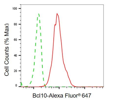 Flow cytometric analysis of Bcl10 expression in HT-1080 cells using Bcl10 antibody. Green, isotype control; red, Bcl10.