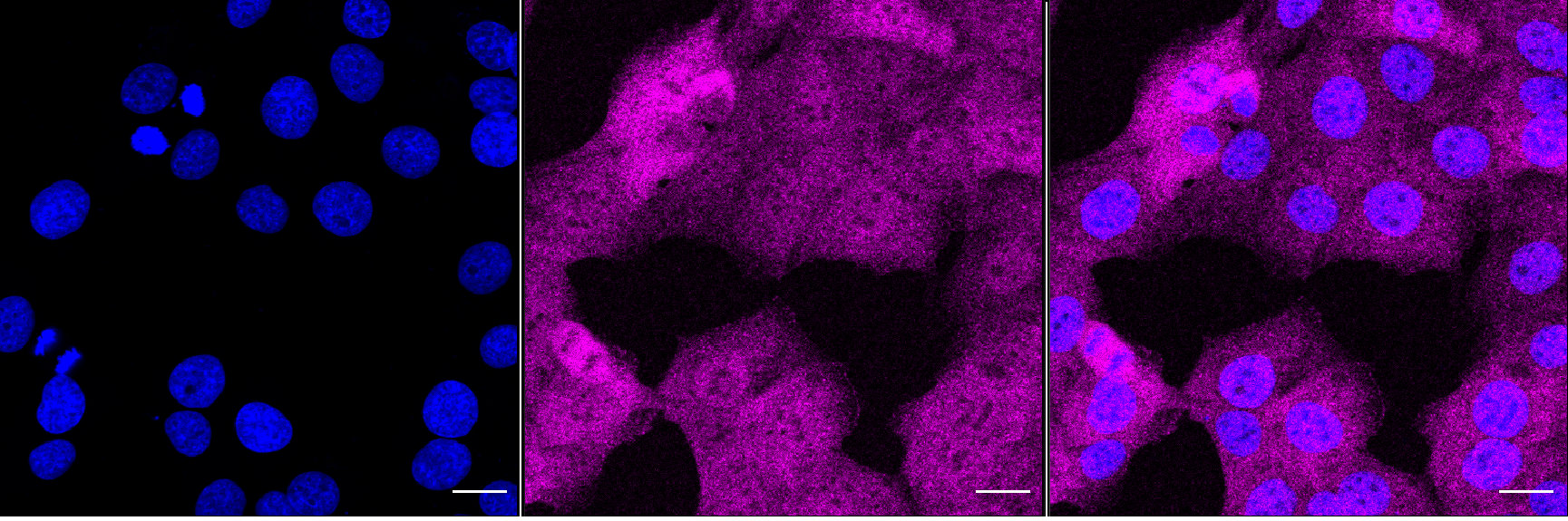 Immunocytochemical staining of HT-1080 cells with Bcl10 antibody. Nuclei were stained blue with DAPI; Bcl10 was stained magenta with Alexa Fluor? 647. Images were taken using Leica stellaris 5. Protein abundance based on laser Intensity and smart gain: Medium. Scale bar, 20 μm.