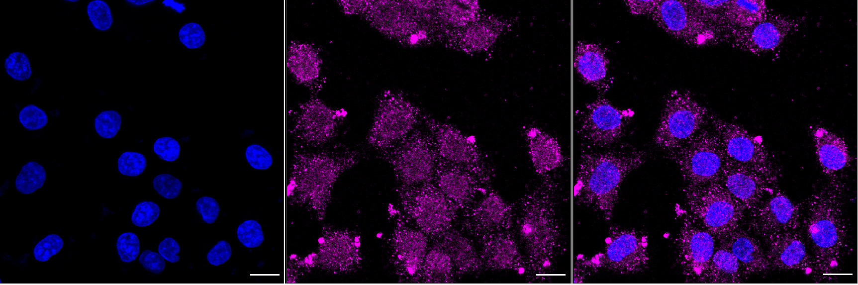 Immunocytochemical staining of HT-1080 cells with BCL2 like 1 antibody. Nuclei were stained blue with DAPI; BCL2 like 1 was stained magenta with Alexa Fluor? 647. Images were taken using Leica stellaris 5. Protein abundance based on laser Intensity and smart gain: Low. Scale bar, 20 μm.