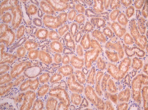 IHC image of CSB-RA552618A0HU diluted at 1:100 and staining in paraffin-embedded human kidney tissue performed on a Leica BondTM system. After dewaxing and hydration, antigen retrieval was mediated by high pressure in a citrate buffer (pH 6.0). Section was blocked with 10% normal goat serum 30min at RT. Then primary antibody (1% BSA) was incubated at 4°C overnight. The primary is detected by a Goat anti-rabbit polymer IgG labeled by HRP and visualized using 0.05% DAB.