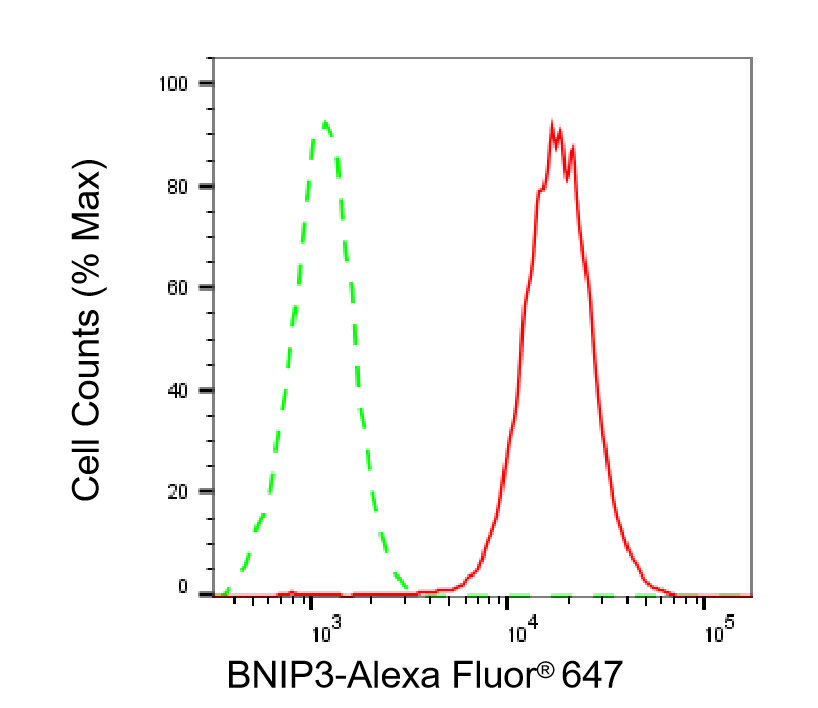 Flow cytometric analysis of BNIP3 expression in C2C12 cells using BNIP3 antibody. Green, isotype control; red, BNIP3.