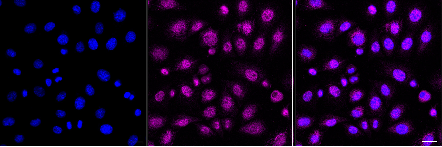 Immunocytochemical staining of C2C12 cells with BNIP3 antibody. Nuclei were stained blue with DAPI; BNIP3 was stained magenta with Alexa Fluor? 647. Images were taken using Leica stellaris 5. Protein abundance based on laser Intensity and smart gain: Medium. Scale bar, 20 μm.