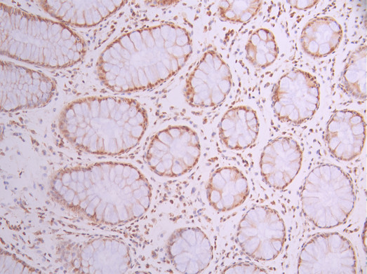 IHC image of CSB-RA986010A0HU diluted at 1:100 and staining in paraffin-embedded human small intestine tissue performed on a Leica BondTM system. After dewaxing and hydration, antigen retrieval was mediated by high pressure in a citrate buffer (pH 6.0). Section was blocked with 10% normal goat serum 30min at RT. Then primary antibody (1% BSA) was incubated at 4°C overnight. The primary is detected by a Goat anti-rabbit polymer IgG labeled by HRP and visualized using 0.05% DAB.