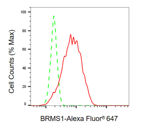 Flow cytometric analysis of BRMS1 expression in HepG2 cells using BRMS1 antibody. Green, isotype control; red, BRMS1.