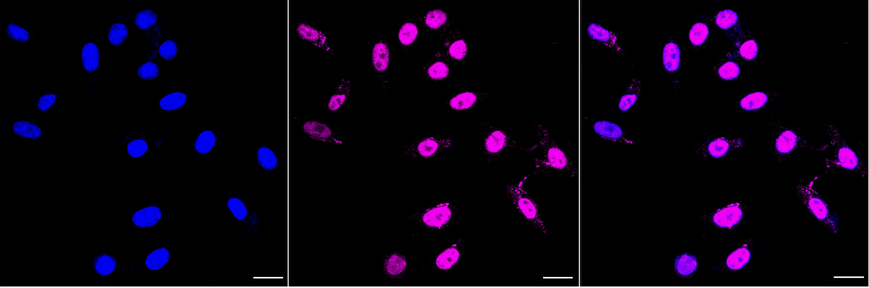 Immunocytochemical staining of HepG2 cells with BRMS1 antibody. Nuclei were stained blue with DAPI; BRMS1 was stained magenta with Alexa Fluor? 647. Images were taken using Leica stellaris 5. Protein abundance based on laser Intensity and smart gain: Medium. Scale bar, 20 μm.