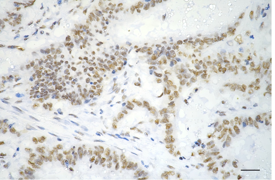 Immunohistochemistry was performed on paraffin-embedded human sigmoid colon carcinoma using BRMS1 antibody. Antigen retrieval was done in sodium citrate buffer (pH 6.0). DAB was used for detection, with hematoxylin counterstaining. Images were acquired using a Nikon Ci-L Plus microscope (40× objective). Scale bar: 25 μm.