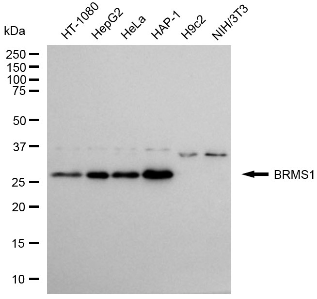 Western blotting analysis using BRMS1 antibody. Total cell lysates (30 μg) from various cell lines were loaded and separated by SDS-PAGE. The blot was incubated with BRMS1 antibody and HRP-conjugated goat anti-rabbit secondary antibody respectively.