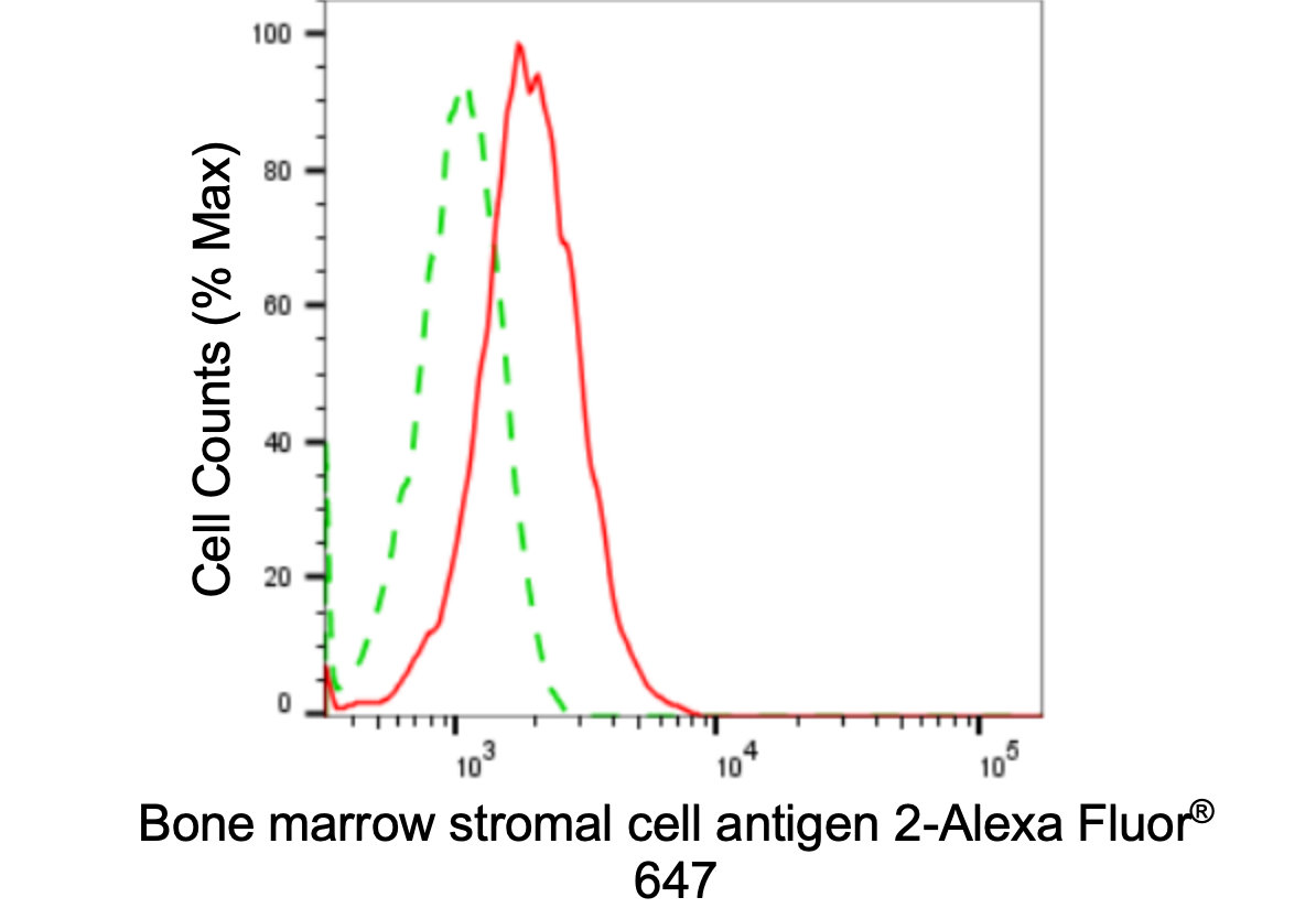 Flow cytometric analysis of bone marrow stromal cell antigen 2 expression in HepG2 cells using bone marrow stromal cell antigen 2 antibody. Green, isotype control; red, bone marrow stromal cell antigen 2.