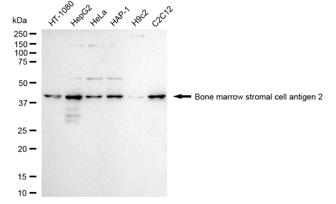 Western blotting analysis using bone marrow stromal cell antigen 2 antibody. Total cell lysates (30 μg) from various cell lines were loaded and separated by SDS-PAGE. The blot was incubated with bone marrow stromal cell antigen 2 antibody and HRP-conjugated goat anti-rabbit secondary antibody respectively.