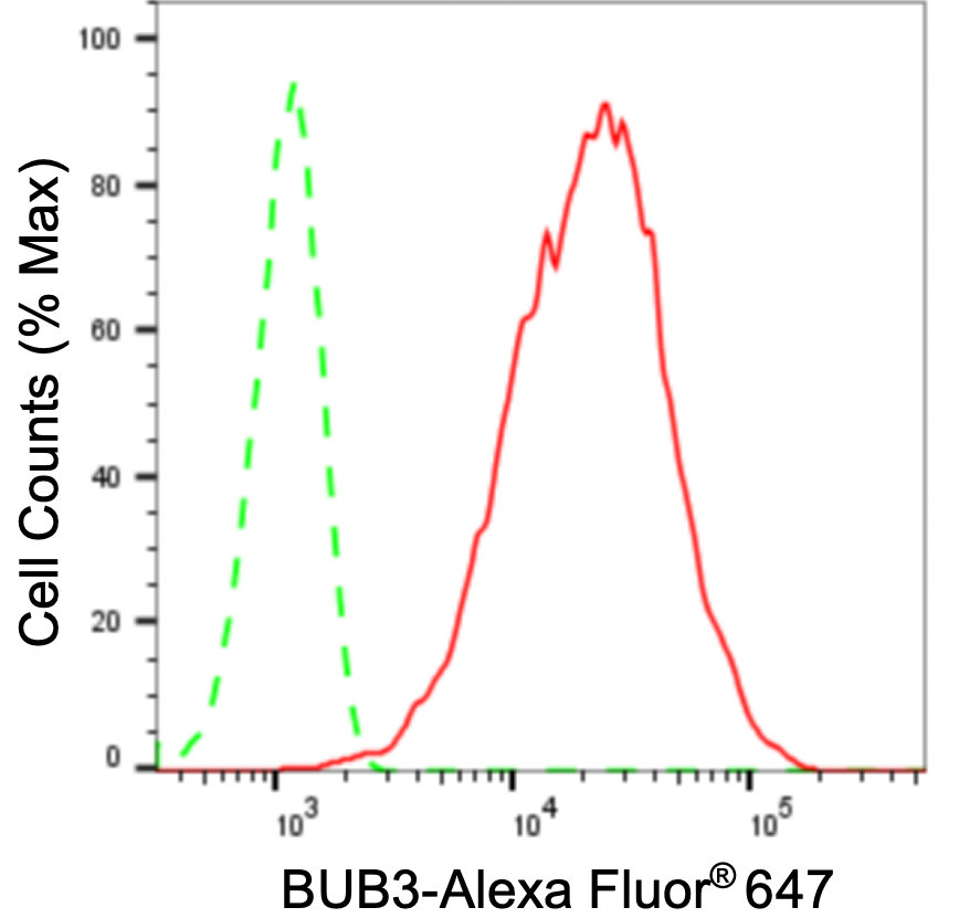Flow cytometric analysis of BUB3 expression in HepG2 cells using BUB3 antibody. Green, isotype control; red, BUB3.