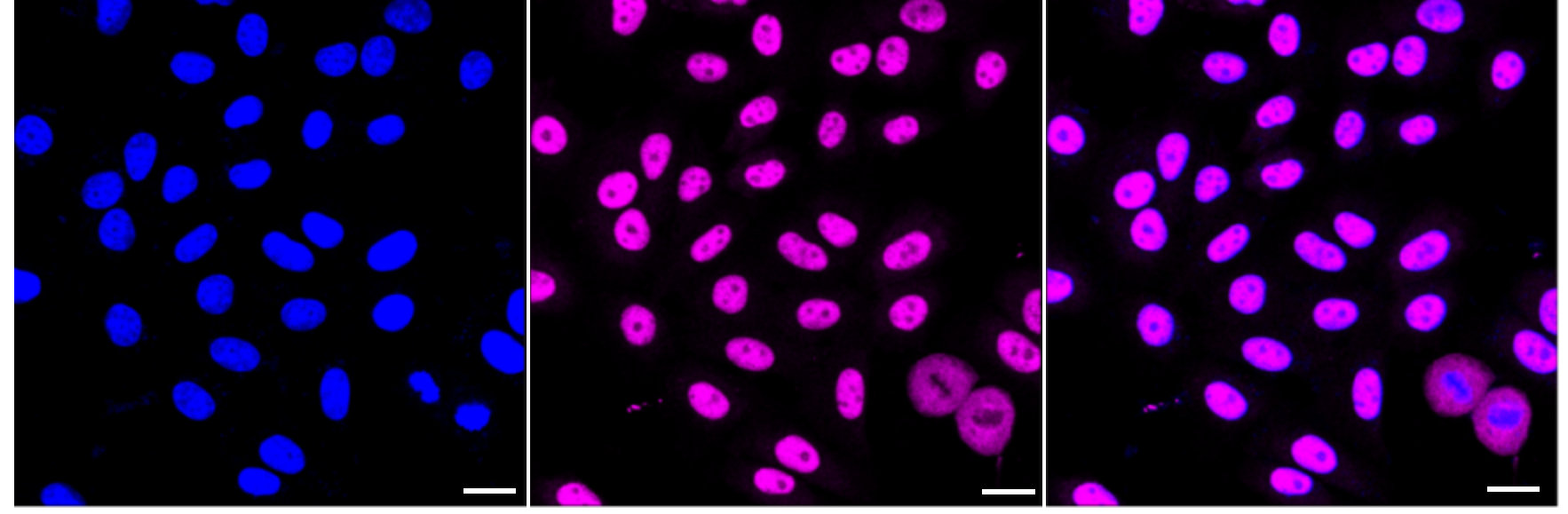 Immunocytochemical staining of HepG2 cells with BUB3 antibody. Nuclei were stained blue with DAPI; BUB3 was stained magenta with Alexa Fluor? 647. Images were taken using leica stellaris 5. Protein abundance based on laser intensity and smart gain: Medium. Scale bar: 20 μm.