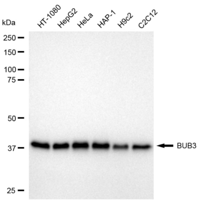 Western blotting analysis using BUB3 antibody. Total cell lysates (30 μg) from various cell lines were loaded and separated by SDS-PAGE. The blot was incubated with BUB3 antibody and HRP-conjugated goat anti-rabbit secondary antibody respectively.