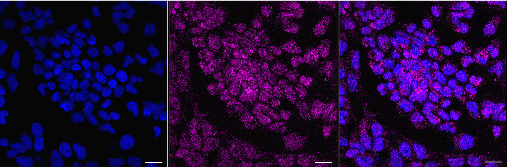 Immunocytochemical staining of HeLa cells with Complement C3 antibody. Nuclei were stained blue with DAPI; Complement C3 was stained magenta with Alexa Fluor? 647. Images were taken using Leica stellaris 5. Protein abundance based on laser Intensity and smart gain: Medium. Scale bar, 20 μm.