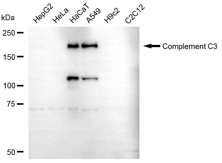 Western blotting analysis using complement C3 antibody. Total cell lysates (30 μg) from various cell lines were loaded and separated by SDS-PAGE. The blot was incubated with complement C3 antibody and HRP-conjugated goat anti-rabbit secondary antibody respectively.