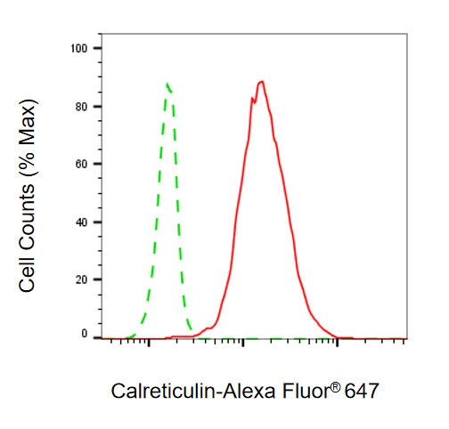 Flow cytometric analysis of Calreticulin expression in C2C12 cells using Calreticulin antibody. Green, isotype control; red, Calreticulin.