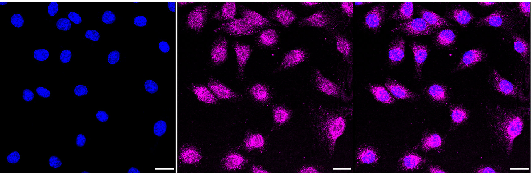 Immunocytochemical staining of C2C12 cells with Calreticulin antibody. Nuclei were stained blue with DAPI; Calreticulin was stained magenta with Alexa Fluor? 647. Images were taken using Leica stellaris 5. Protein abundance based on laser Intensity and smart gain: Medium. Scale bar, 20 μm.