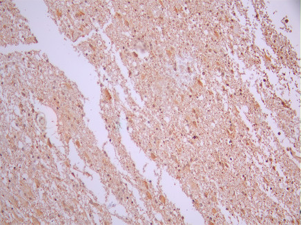 IHC image of CSB-RA922077A0HU diluted at 1:100 and staining in paraffin-embedded human glioma cancer performed on a Leica BondTM system. After dewaxing and hydration, antigen retrieval was mediated by high pressure in a citrate buffer (pH 6.0). Section was blocked with 10% normal goat serum 30min at RT. Then primary antibody (1% BSA) was incubated at 4°C overnight. The primary is detected by a Goat anti-rabbit polymer IgG labeled by HRP and visualized using 0.05% DAB.