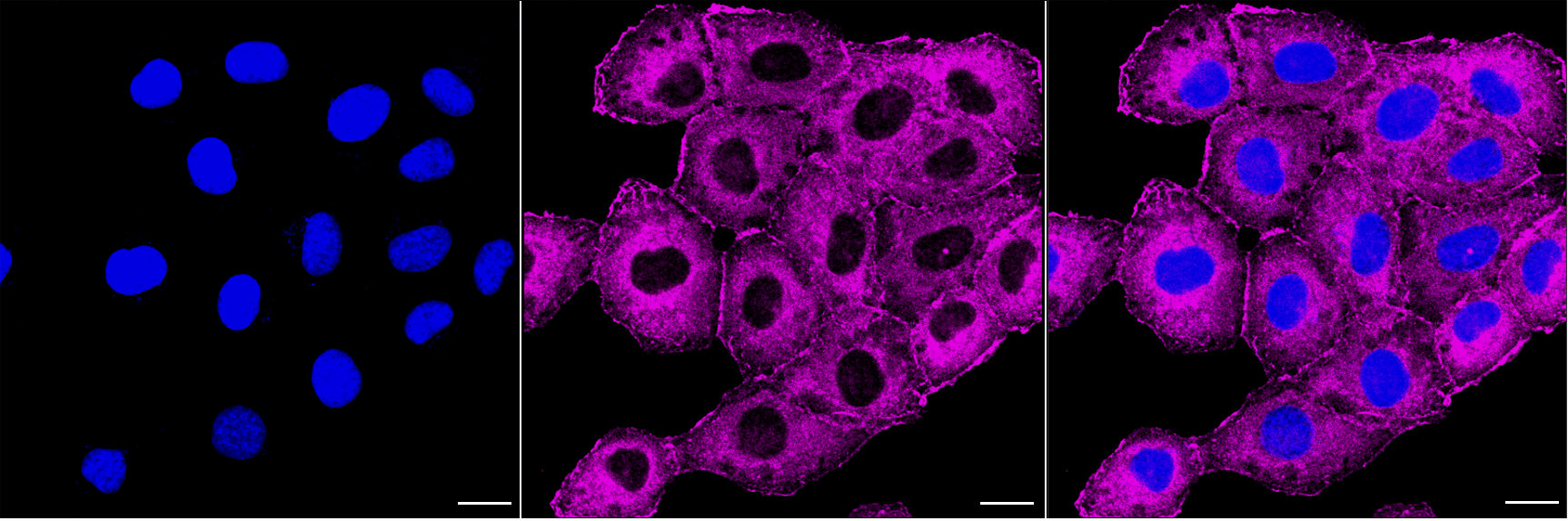 Immunocytochemical staining of HT-1080 cells with CAP1?antibody. Nuclei were stained blue with DAPI; CAP1 was stained magenta with Alexa Fluor? 647. Images were taken using Leica stellaris 5. Protein abundance based on laser Intensity and smart gain: Medium. Scale bar, 20 μm.