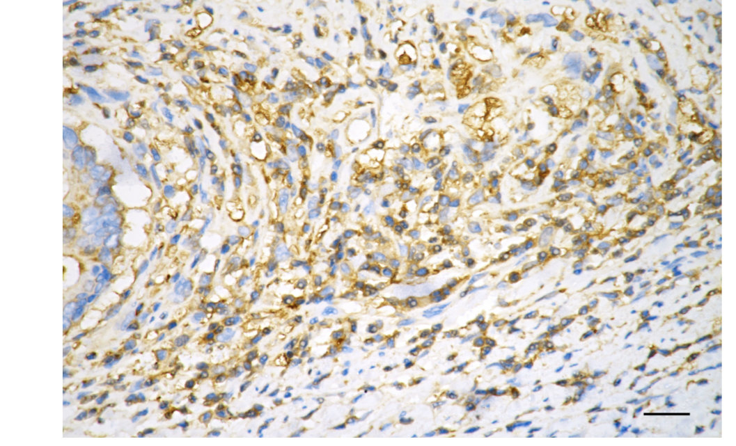 Immunohistochemistry was performed on paraffin-embedded human sigmoid colon carcinoma using CAP1 antibody. Antigen retrieval was done in sodium citrate buffer (pH 6.0). DAB was used for detection, with hematoxylin counterstaining. Images were acquired using a Nikon Ci-L Plus microscope (40× objective). Scale bar: 25 μm.