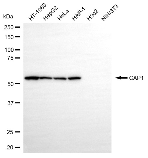 Western blotting analysis using CAP1 antibody. Total cell lysates (30 μg) from various cell lines were loaded and separated by SDS-PAGE. The blot was incubated with CAP1 antibody and HRP-conjugated goat anti-rabbit secondary antibody respectively.
