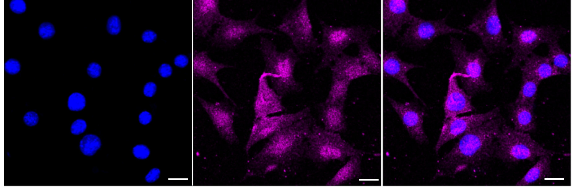 Immunocytochemical staining of C2C12 cells with CAPG antibody. Nuclei were stained blue with DAPI; CAPG was stained magenta with Alexa Fluor? 647. Images were taken using leica stellaris 5. Protein abundance based on laser intensity and smart gain: Medium. Scale bar: 20 μm.