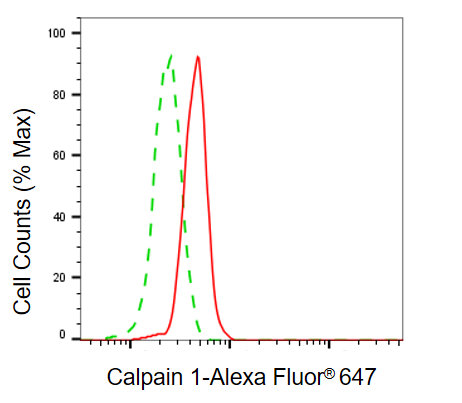 Flow cytometric analysis of calpain 1 expression in C2C12 cells using calpain 1 antibody. Green, isotype control; red, calpain 1.