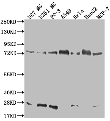 Positive WB detected in: U87 whole cell lysate, U251 whole cell lysate, PC3 whole cell lysate, A549 whole cell lysate, Hela whole cell lysate, HepG2 whole cell lysate, MCF-7 whole cell lysate