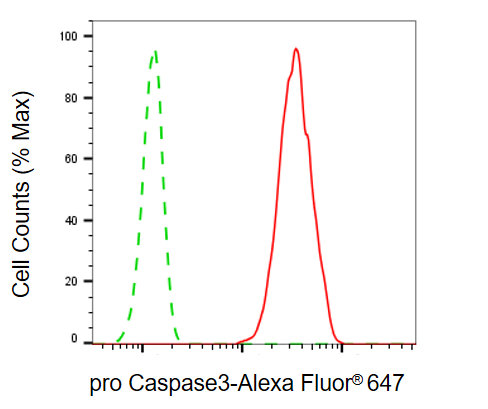 Flow cytometric analysis of pro caspase3 expression in HT-1080 cells using pro caspase3 antibody. Green, isotype control; red, pro caspase3.