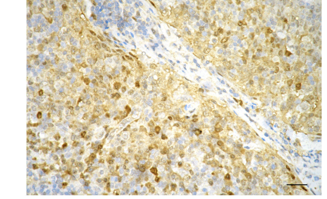 Immunohistochemistry was performed on paraffin-embedded human tonsillitis using pro caspase 3 antibody. Antigen retrieval was done in sodium citrate buffer (pH 6.0). DAB was used for detection, with hematoxylin counterstaining. Images were acquired using a Nikon Ci-L Plus microscope (40× objective). Scale bar: 25 μm.
